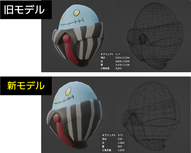 そこで今回は、サブディビジョンをかける際も、形状が大きく変わる部分以外の不要な面を削除し、効率的に面の数を減らす工夫を施しました。また、自動スムース機能を活用することで、過剰に分割数を増やすことなく滑らかな見た目を実現しています。こうした手法を組み合わせることで、見た目の品質を維持しつつ軽量化を図ることができました。
